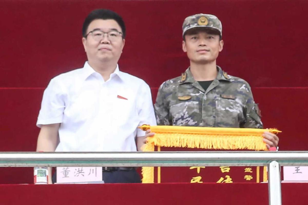 校长董洪川代表学校向承训部队赠送锦旗,感谢承训教官们以军人风采以身作则,严格施训、科学施训、因材施训。