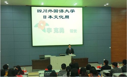 首先,李克勇致辞。他用热情洋溢的话语祝贺日语系日本文化周的举行,表达了学校对日本文化周活动举办的美好祝愿以及对日本驻重庆总领事馆多年来对我校举办日本文化周活动给予的一贯关心和多方支持、配合的感谢,并对同学们加深中日两国传统文化的交流、了解、理解和友谊寄予衷心希望与期待。