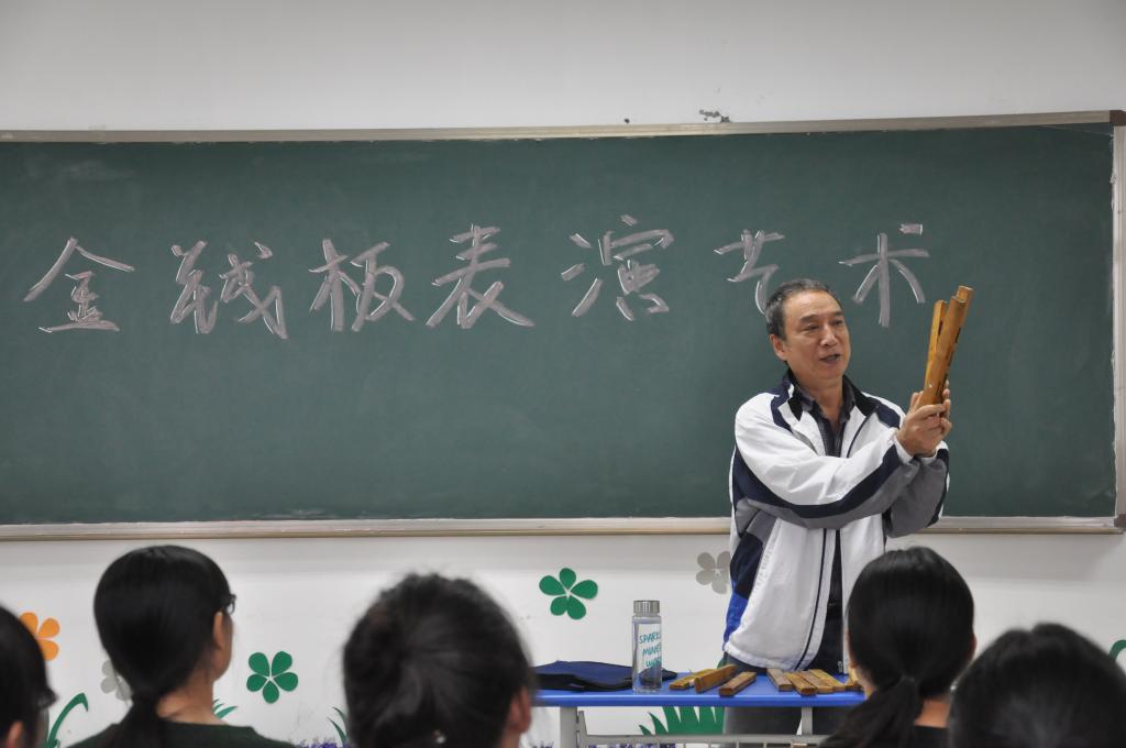 学校于2015年起开设《金钱板表演艺术》实践选修课,2016年起开设《文化遗产保护》专业限选课,聘请金钱板国家级代表性传承人、国家一级演员丁长福担任学校客座教授,担纲传承队伍领军人。通过金钱板课程教学、课程实践、文化实践广泛辐射青年师生。结合技法实践和培养规律,将非遗艺术中的思想理念、技法形式、编创规则等核心内容规范编入课程教学大纲和教案。