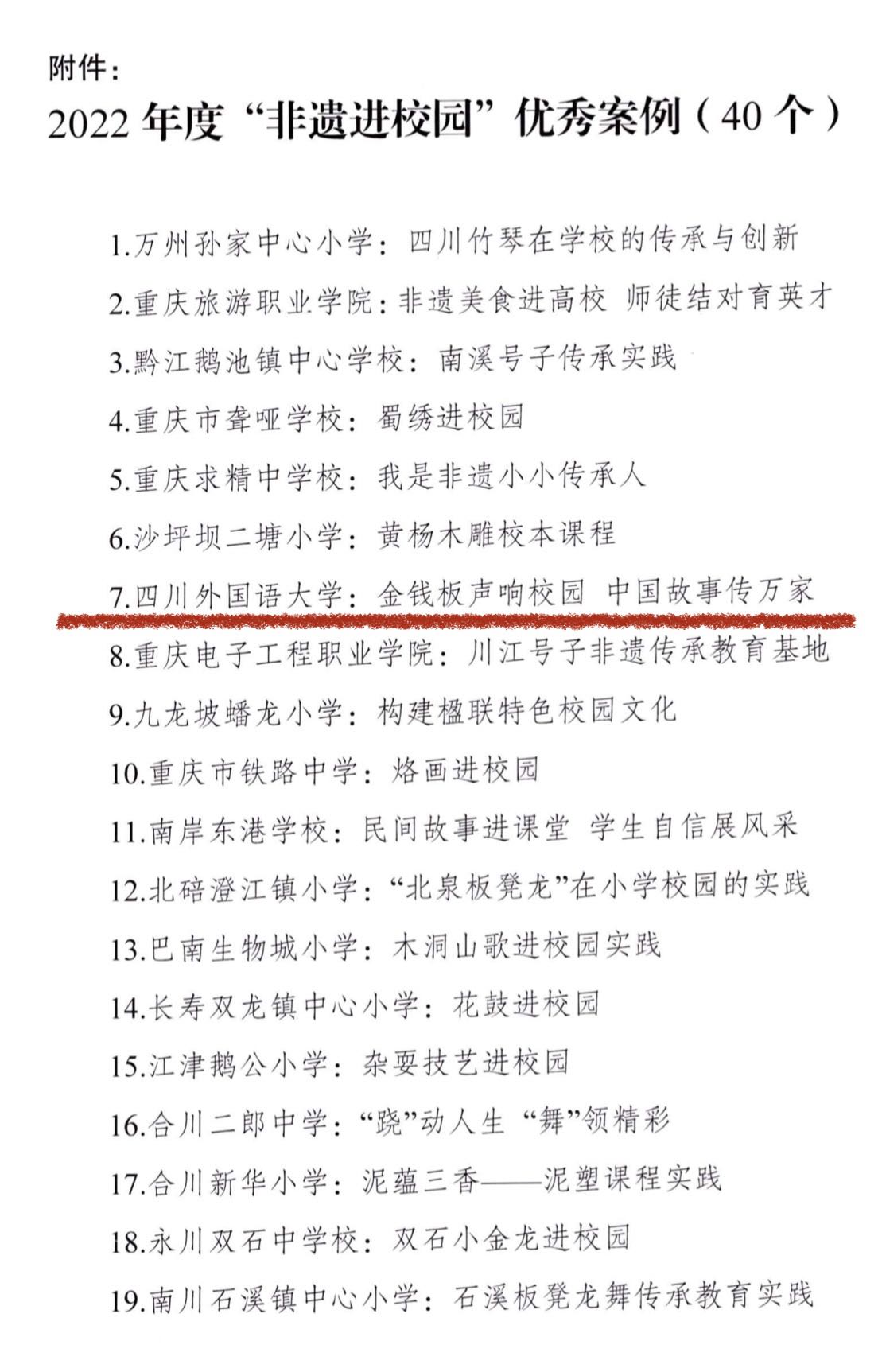 为贯彻落实中共中央办公厅、国务院办公厅印发《关于进一步加强非物质文化遗产保护工作的意见》,推动非遗融入国民教育体系,促进非物质文化遗产在青少年群体中的普及传承与传播,弘扬发展中华优秀传统文化,按照市文化旅游委2022年工作的总体部署,市非遗保护中心、市非遗保护协会组织开展了2022年度“非遗进校园”优秀案例征集活动。经专家评选,我校“金钱板声响校园 中国故事传万家”入选重庆市2022年度“非遗进校园”优秀案例。