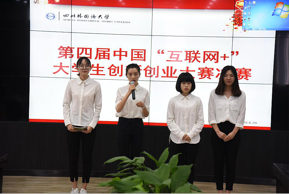 2018年6月20日下午2点,四川外国语大学第四届中国“互联网+”大学生创新创业大赛决赛(以下简称“互联网+”)在行政楼C117会议室如期举行,来自各院系的21支参赛队伍同台竞技。此次大赛由四川外国语大学教务处主办和承办。本次大赛邀请到我校陈汝平老师、王伟老师、汪世珍老师、鲜京宸老师、王琥老师担任专家评委。副校长祝朝伟与150余名师生共同观看了此次比赛。