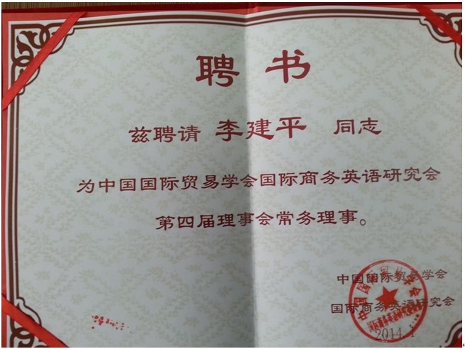 经过近一年的申报、相关部门的评估和最终审核,我校已成为中国国际贸易学会国际商务英语研究会第四届常务理事单位,我校副校长李建平教授被推选为该研究会常务理事。