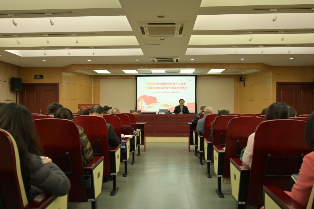 编者按:党的十九届四中全会是我们党站在“两个一百年”奋斗目标历史交汇点上,是在新中国成立 70 周年之际、我国处于中华民族伟大复兴关键时期召开的一次具有开创性、里程碑意义的重要会议。全会聚焦坚持和完善中国特色社会主义制度、推进国家治理体系和治理能力现代化这一主题,审议通过了《中共中央关于坚持和完善中国特色社会主义制度、推进国家治理体系和治理能力现代化若干重大问题的决定》,具有十分重要的现实意义和深远的历史意义。根据中央的统一部署和市委、市委教育工委有关要求,学校党委下发《关于学习宣传贯彻党的十九届四中全会精神的通知》,在11月份党委理论学习中心组、教职工政治理论学习、主题党日学习的基础上,组建宣讲小组,面向师生员工深入开展宣讲,掀起学习宣传贯彻党的十九届四中全会精神的热潮。