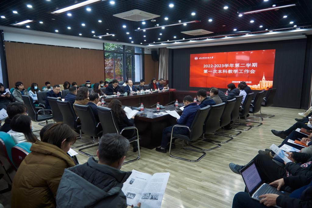 2月23日下午,2022-2023学年第二学期第一次本科教学工作会在立德楼C117室召开,校长董洪川、副校长王仁强出席并讲话。各教学单位院长、教学副院长、教学秘书、研究生院、教育规划与评估院、教师发展中心、人事处、学生处、招生就业处、国际合作与交流处、计划财务处、网络信息中心、图书馆负责人及教务处科长以上管理人员参加会议,会议由副校长王仁强主持。