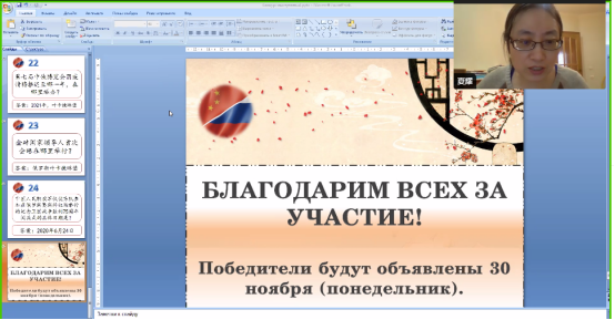 经过一小时的角逐,12名选手均获得名次,第一名、第二名、第三名各4人。其中,玛格丽特·阿巴什娜、(新西伯利亚国立大学孔子学院东方学专业四年级),叶果尔·别杰赫金(新西伯利亚国立大学孔子学院语言学专业二年级),尼肯基娜·达利亚(圣彼得堡国立大学三年级),格拉特科娃·叶卡捷琳娜(新西伯利亚国立师范大学四年级)获得并列第一名的好成绩。