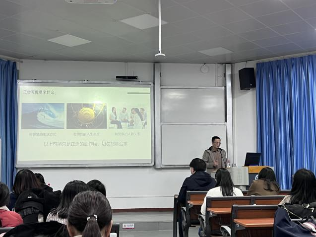在结束之时,符巍专家带领大家闭上眼睛,静坐深呼吸,通过肢体的膨胀和消沉去调整呼吸,去除杂念,恢复能量,调整心态。符巍专家将“知足且上进,温柔而坚定”作为讲座结束语,这既是对正念活动内容的展望总结,也是对讲座现场教职工的美好祝愿。