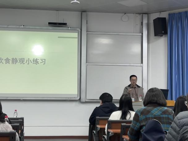 讲座首先进行了十分钟的“饮食静观小练习”,让大家分别从视觉、听觉、嗅觉、触觉去感受食物的存在,在这个过程里,老师们专注当下,享受与平时不同的新感受。
