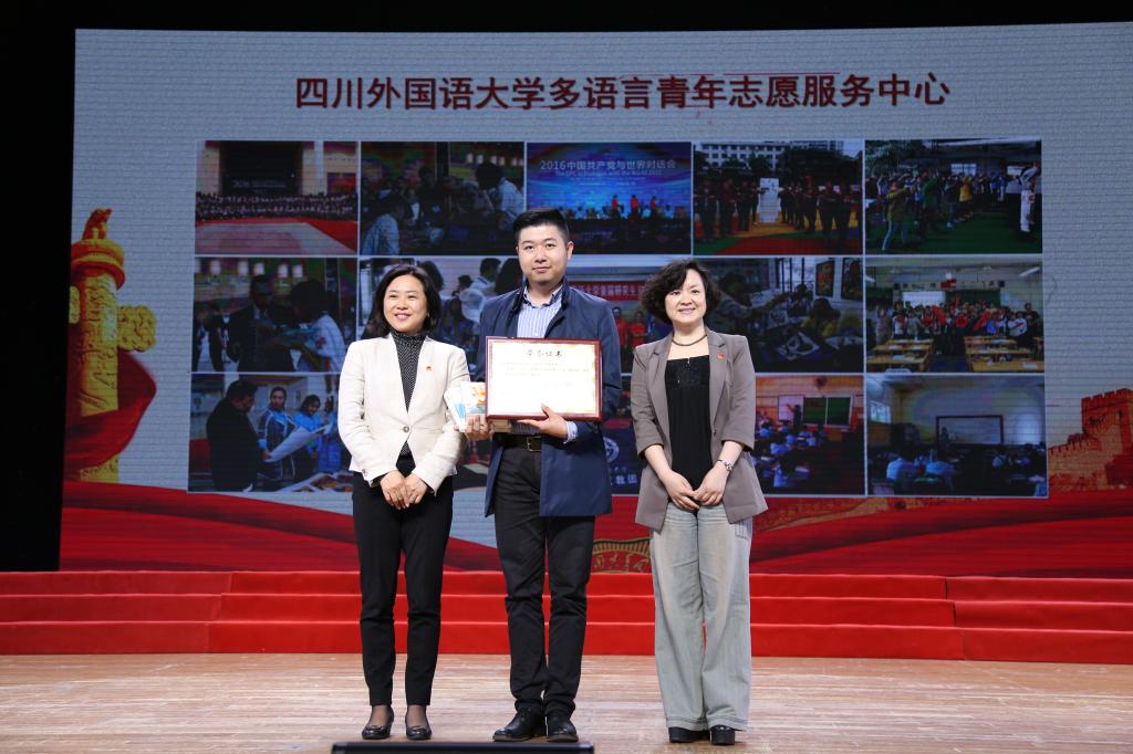 为我校多语言青年志愿服务中心主任陈派颁发第十一届中国青年志愿者优秀组织奖