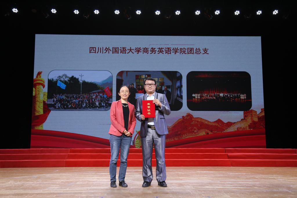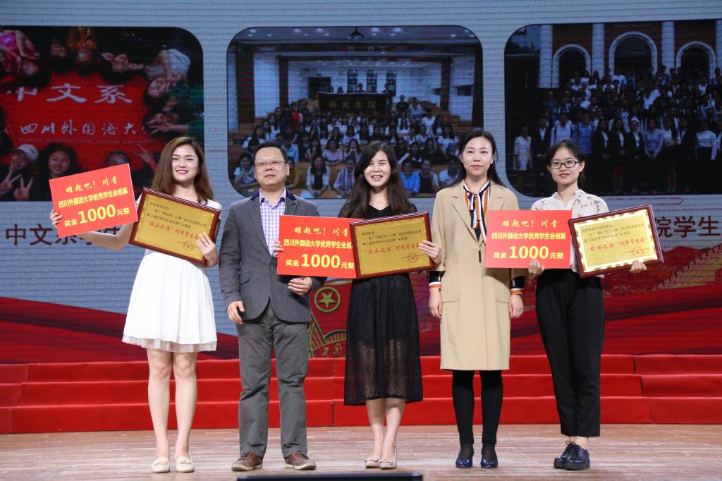 我校党委学工部部长古晶和党委研工部部长淡修安为我校中文系学生会、研究生会、国际教育学院学生会颁发第二届“雄起吧!川青”四川外国语大学优秀学生会奖项