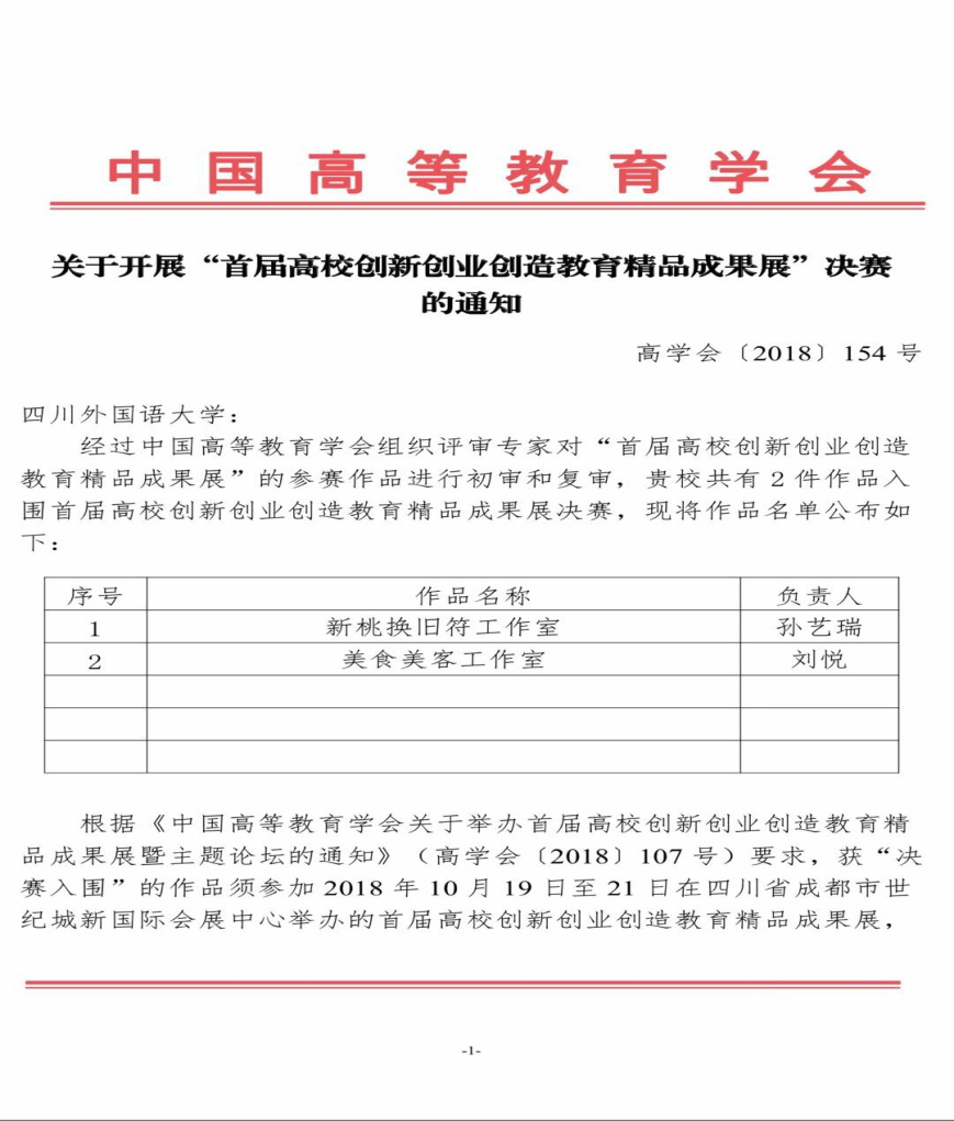 日前,由中国高等教育学会主办的“首届高校创新创业创造教育精品成果展”决赛通知正式下达,我校“新桃换旧符”团队、“美食美客”团队经过多轮选拔,最终入围前150强,将于10月19-21日参加在成都举办的决赛。