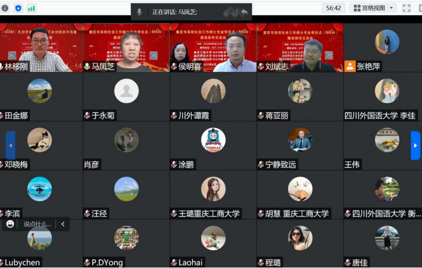 6月9日下午16:00,四川外国语大学国际法学与社会学院、重庆工商大学法学与社会学学院、重庆师范大学历史与社会学院众多老师欢聚一堂,共同探讨社会工作硕士(MSW)专业学位点建设与发展问题。座谈会邀请到全国社会工作专业学位研究生教育指导委员会副主任委员、中国社会工作教育协会副会长兼秘书长、北京大学社会工作硕士教育中心主任马凤芝教授莅临指导,四川外国语大学副校长王仁强教授代表三所学校老师致辞。三所高校近60名教师线上参会。