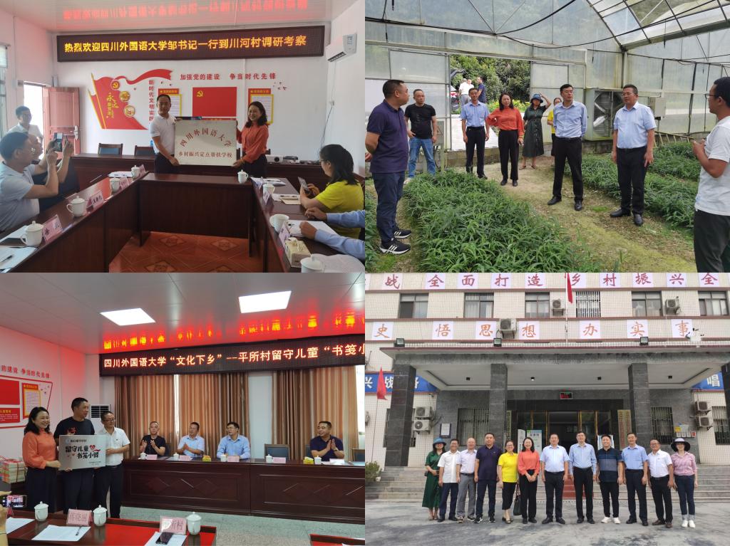 邹渝一行看望慰问了学校驻乡工作队队员官晴华、驻村书记马驭骅、李正廷和李江,实地考察了涌洞乡药王谷基地,挂牌四川外国语大学乡村振兴定点帮扶学校--川河村小学;实地考察了隘口镇电商产业园及东坪村黄精育苗基地、屯堡村茶叶基地,并在平所村开展了送“文化下乡”---图书、学习用品捐赠仪式。