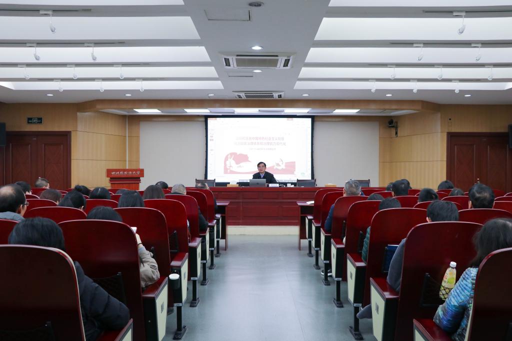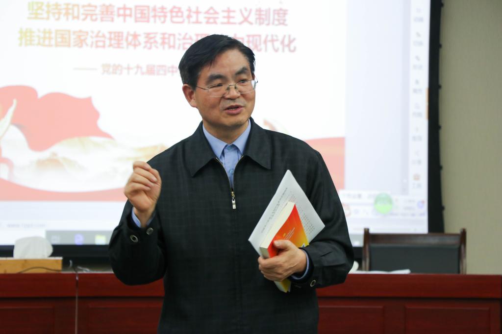 12月11日,校长李克勇为审计处、离退休工作处、校友工作办公室、国际关系学院、法语意大利语系教职工宣讲党的十九届四中全会精神。