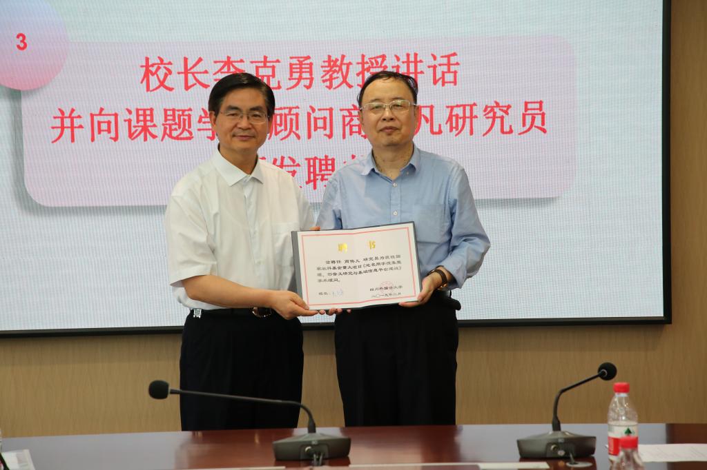 第一阶段,商伟凡研究员学术顾问聘任仪式,由四川外国语大学科研处李小青处长主持。课题组首席专家周文徳教授对课题准备情况作了简单介绍。他讲道,在学校党政领导的关怀与支持下,在科研处、图书馆及相关职能部门的大力支持下,课题组成员通力合作,已召开了3次小型研讨会。资料搜集是课题最重要也是最困难的环节,大家一定会努力地克服困难,把项目做好做实。随后,四川外国语大学李克勇校长讲话,并向商伟凡研究员颁发课题学术顾问聘书。