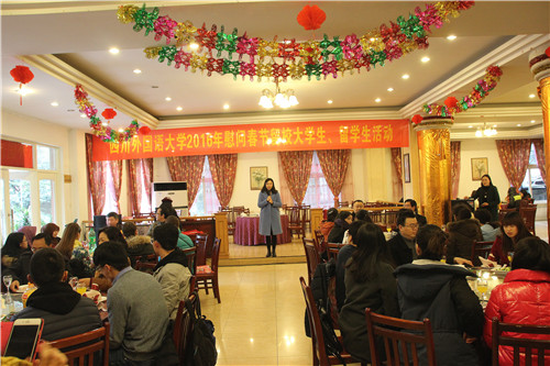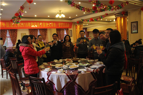 2016年慰问春节留校大学生、留学生活动在东苑餐厅举行。校长李克勇,副校长乐勇、董洪川、郑白玲,学生处、党政办、宣传部、国际合作与交流处、研工部、留学生部负责人以及教师、辅导员代表与