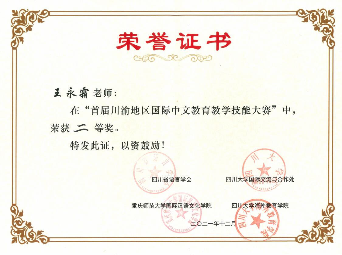 2021年12月25日,由四川省语言学会、四川大学国际合作与交流处、四川大学海外教育学院、重庆师范大学国际汉语文化学院、成渝地区双城经济圈孔子学院联盟联合主办的首届川渝国际中文教育教学技能大赛在四川大学落下帷幕。我校国际学院(出国培训部)教师王永霜在决赛中,为现场评委和观摩的师生展现了一堂以“汉字六书”为题的文化通识课,喜获二等奖!