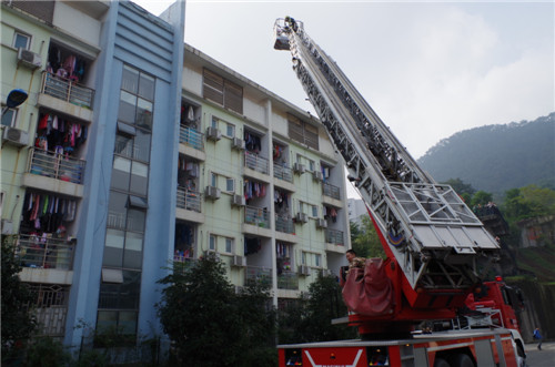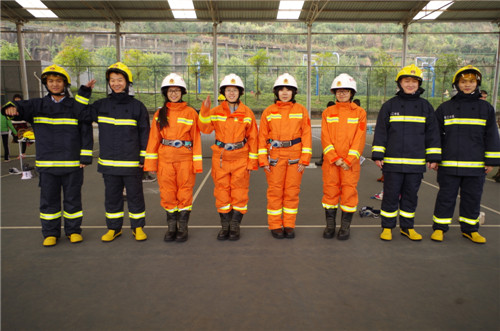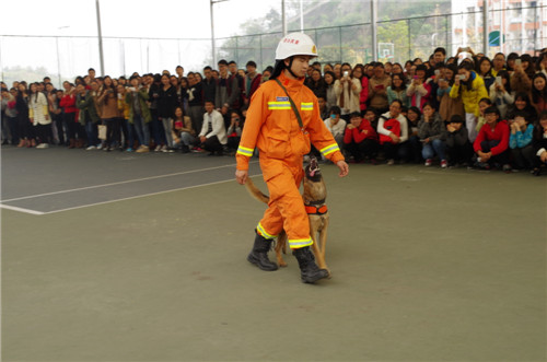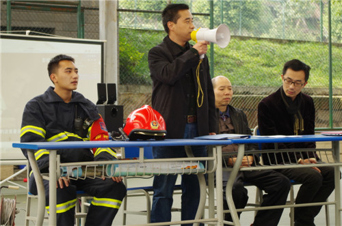 本次活动以“关注消防、保障师生平安;珍爱生命、共创平安校园”为主题进行消防实战演练。重庆市消防特警第二支队领导对此次活动高度重视,共派出30余名消防官兵、四辆消防车、两只警犬参与实战演练。演练内容包括水弹灭火、人员搜救等项目。当现场火灾警报一拉响,消防队员立即箭一般地冲往事发地点,紧急疏导同学们有序逃离。此前,学生公寓管理科周晓琳老师率全体科室人员也早早地来到现场,并协助消防官兵疏散学生。当闻讯松苑一舍三楼寝室有人员被困,赶往救援的消防队员迅速用担架将他们抬出并及时送到了临时救护区;当目睹楼顶有人员被困并挥舞毛巾发出求救信号时,消防队员又旋即启用救生云梯,将被困学生从高处成功救回。整个演练过程紧张有序、每一位参与演练的同学都按照消防官兵和公寓管理科老师们的疏导撤退到了安全区域。消防官兵们的飒爽英姿和公寓管理科老师们的尽心尽职给现场的师生留下了深刻印象,尤其是消防官兵们面对火灾时候的挺身而出,更是让大家感动不已。