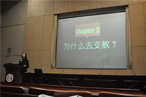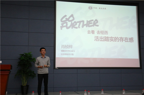 随后,来自7个院系的9名代表分享了自己的社会实践经历与心得。从德勤全球交付中心到渣打银行,从客轮安全数据分析到西班牙一线体育新闻采集,无论是支教中东,还是对老城区的社会调查,都有他们知行合一矫健的身影。自西班牙语系的王峰伟同学讲述了自己去年九月前往西班牙参加交换生项目的经历。他表示,培养广泛的业余爱好,以自己的兴趣和特长为切入点寻找实践锻炼的机会是十分重要的。他因为足球这个爱好由被动变为主动地去强化了自己的专业知识,从而得到了更多宝贵的社会实践机会。熊玮同学根据自身在渣打银行经历向学弟学妹们分享了几个关于求职应聘的经验和技巧,并表示,懂得把握,不断学习与坚持是她在渣打银行学到的宝贵品质。社会学系的肖桢梓同学则用风趣幽默的语言与大家分享了自己在德勤交互中心实习的经历,在两次错过德勤的面试后,他终于抓住了第三次机会,并用自己优异的表现赢得了领导高层的肯定。他说,努力学习、适应压力、学会合作是他获得的宝贵经验。其余杰出代表也一一向大家分享了自己的社会实践心得,并鼓励同学们用实践丰富青春,用才干回报社会。