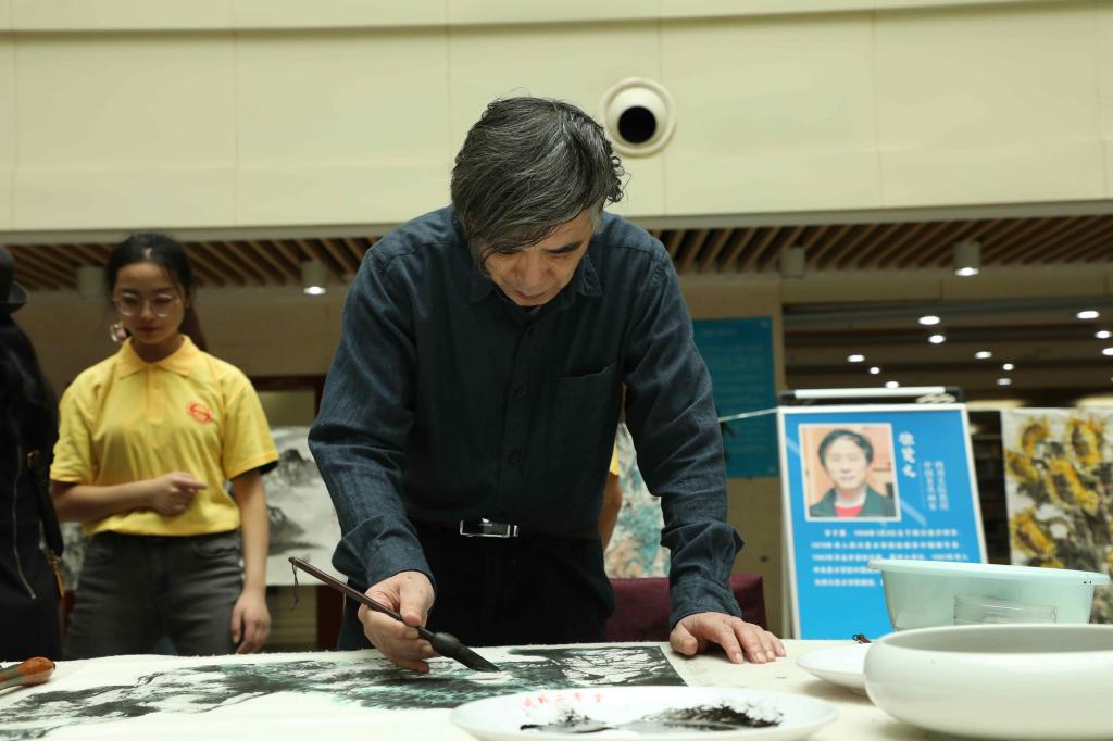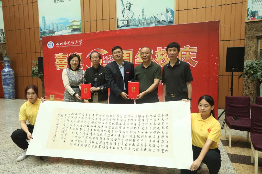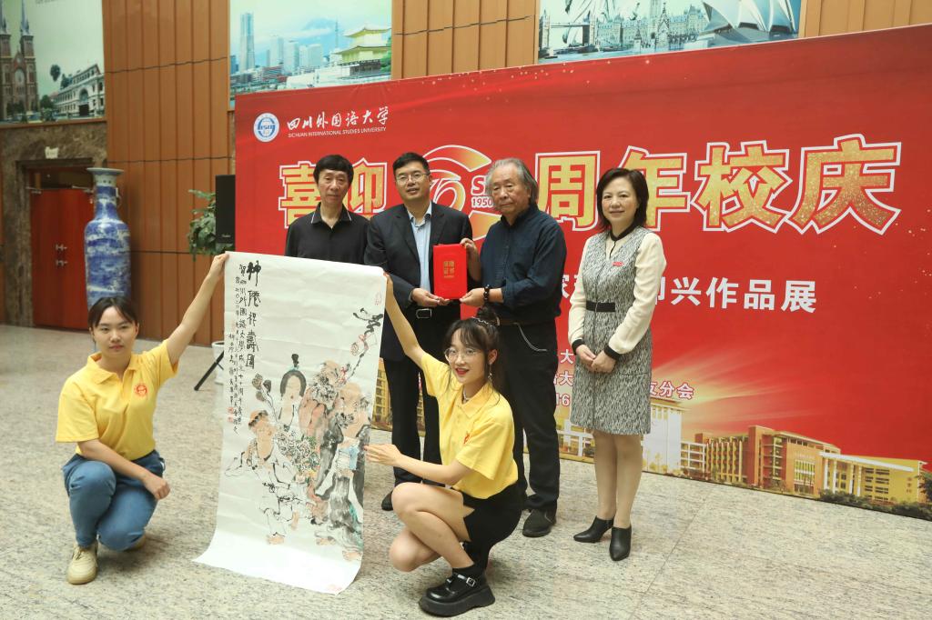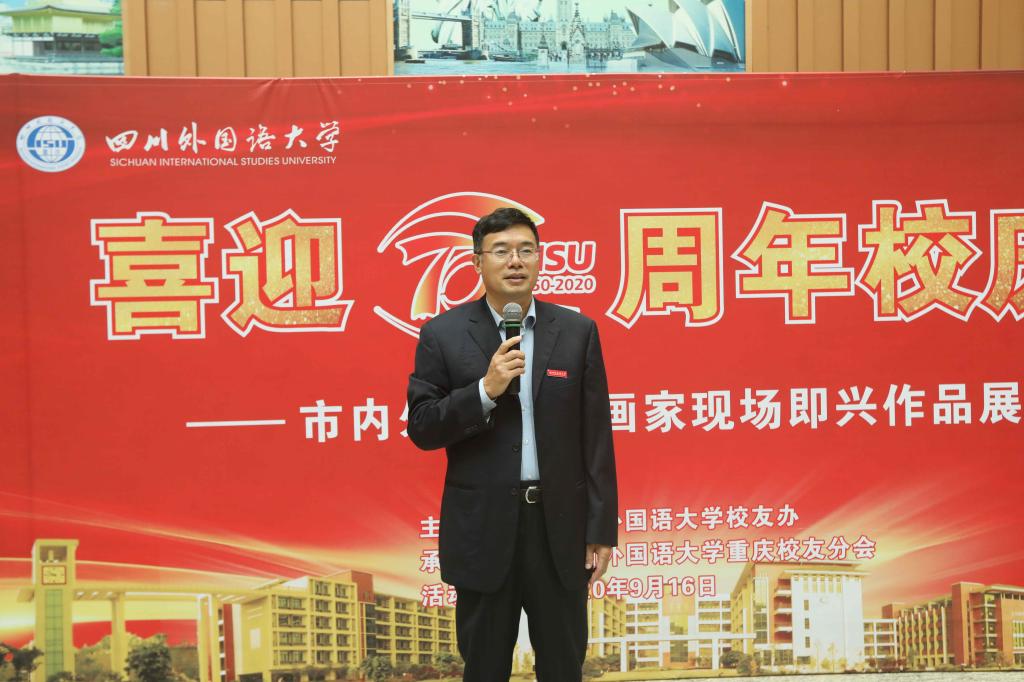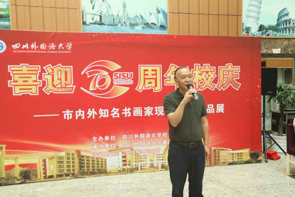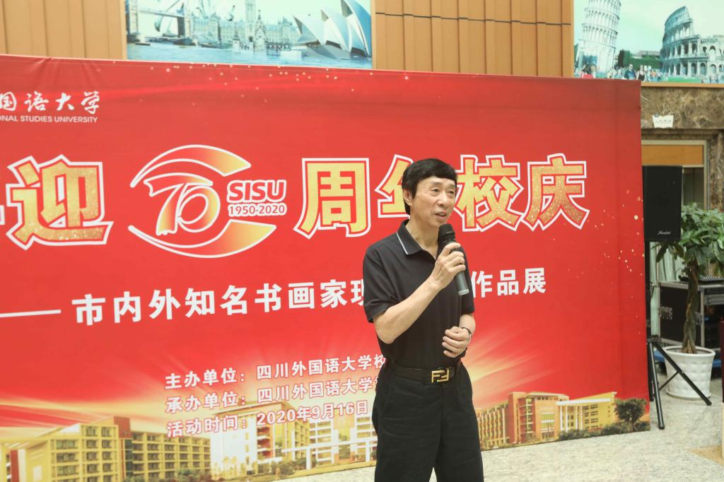 重庆市文联副主席、作家、诗人杨矿在致辞中表示非常荣幸受邀参加此次活动,很高兴与其余的9位知名艺术家齐聚川外,以书画的形式为川外70周年校庆献上美好祝福,希望川外未来更加辉煌,引领时代,永立潮头。