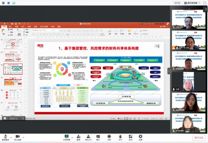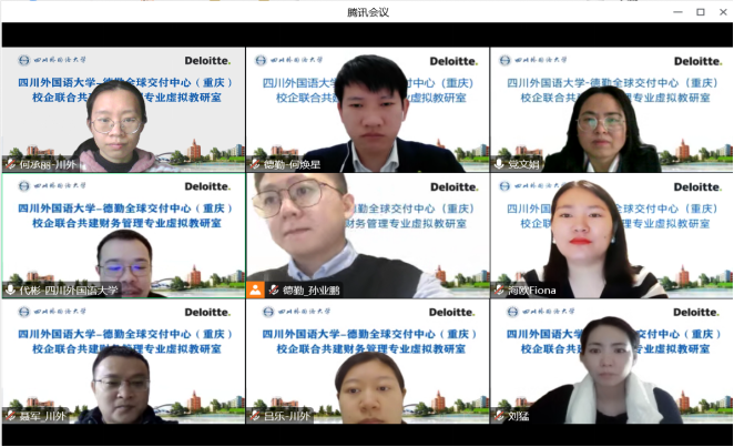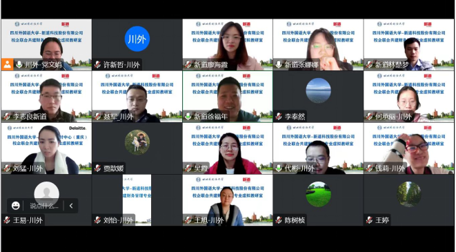 虚拟教研室采用“1+2+N”的校企共建模式:1表示由四川外国语大学牵头,2表示以德勤全球交付中心(重庆)、新道科技股份有限公司为核心的2家领军合作企业,N表示以江裕财税集团等为代表的数家重点合作企业。近期,国际工商管理学院副院长代彬、党总支副书记王婷、院长助理党文娟、计划财务处副处长连军以及相关专业教师一道与来自德勤全球交付中心(重庆)的数字化鉴证事业部高级经理何焕星、人力资源总监孙业鹏等,以及来自新道科技股份有限公司的新财经业务总监张娜娜、重庆公司总经理徐福年等企业专家就如何共建虚拟教研室分别举行了多轮次的在线研讨。
