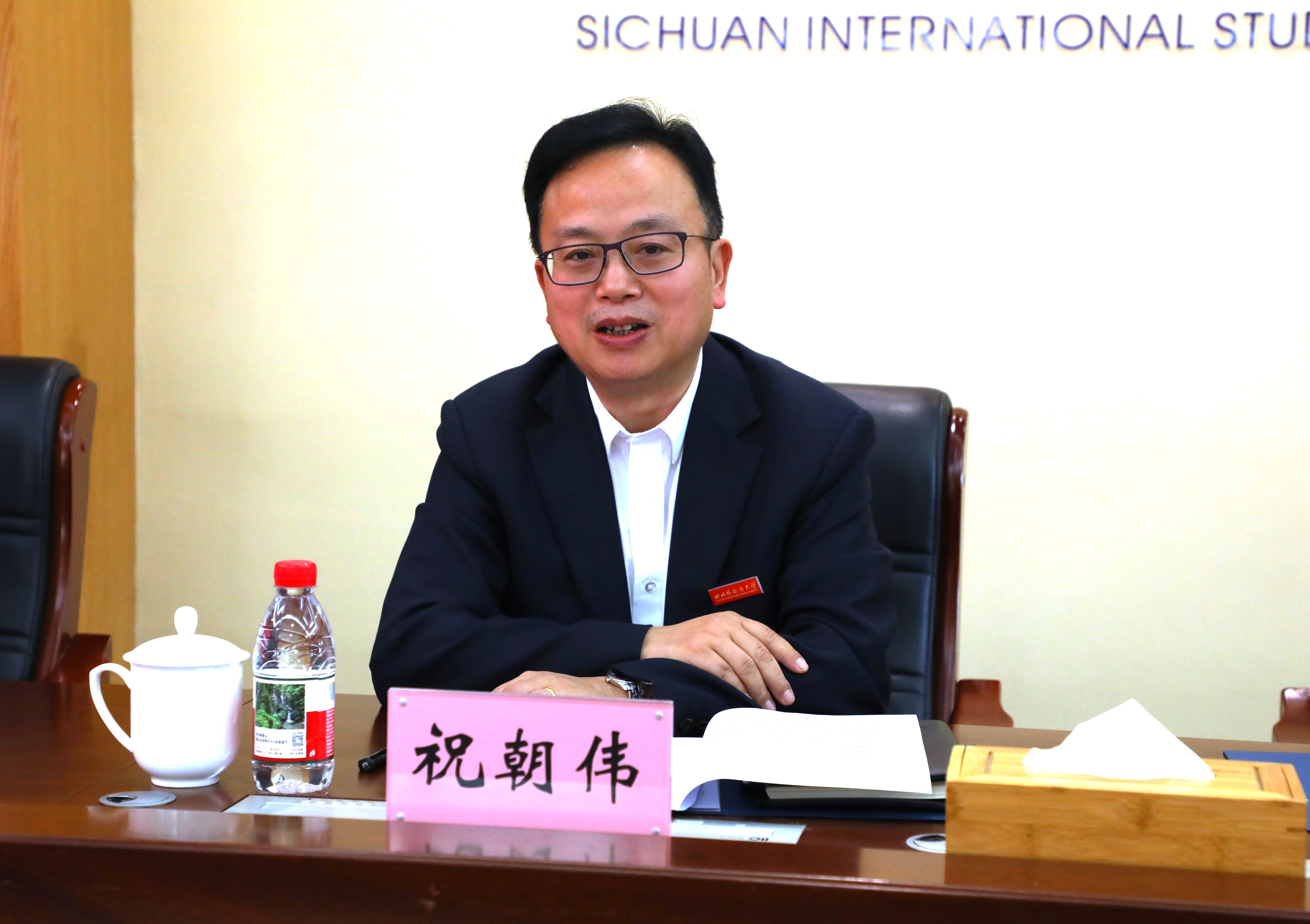 祝朝伟代表学校对郭云东一行表示热烈欢迎,介绍了我校办学历史、学科布局、人才培养体系及“十五五”规划编制总体思路。他指出,川外坚持以新文科建设为牵引,持续优化专业结构、强化通识教育与专业教育融合,不断提升复合型、创新型、国际化人才培养质量,愿与内江师范学院加强交流合作,为推进成渝地区双城经济圈建设助力,共同推动高等教育高质量发展。