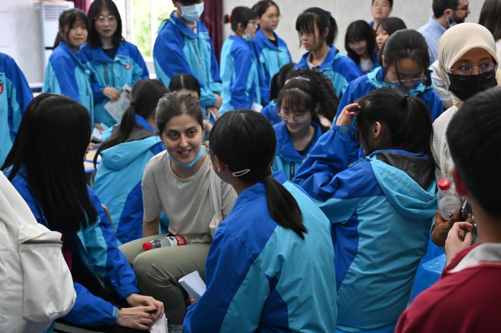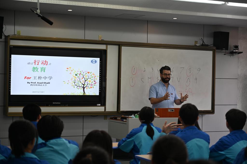 北碚区王朴中学由红岩英烈王朴同志于1946年创办,是“重庆市重点中学”、也是“重庆市红岩精神教育基地”。上午9时许,外籍师生们在王朴中学学生志愿者的带领下,通过参观校园文化墙等,感知学校班级文化、楼道文化等校园文化氛围,了解王朴中学的发展历程和办学特色。随后,大家与来自王朴中学高二年级的40余名学生在学校录播室同上文化交流示范课。示范课上,王朴中学的惠强强老师以端午节为例,给大家讲授了中国的传统文化节日,我校叙利亚籍教授阿萨德以“通过行动去教育”为题给中学生们分享了如何成为祖国和社会的栋梁之材,示范课程吸引了王朴中学全校1800余名师生通过在线直播一同参与。课后外籍师生们还就如何教授外语以及如何学习外语等大家关心的话题,与王朴中学的师生分组进行了互动交流。通过学习交流,增进了外籍教师们对王朴中学探索独具特色的乡村优质教育发展之路的了解。王朴中学校长李忠良等领导也表达了希望能够与川外进一步深化合作,带动学校走上内涵式发展的快车道的意愿。