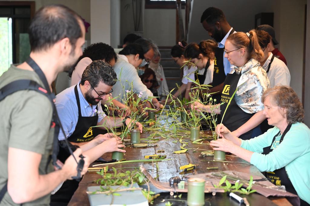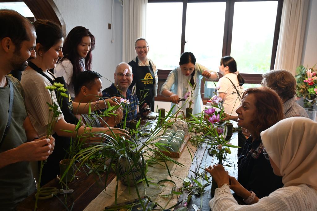 位于北碚区静观镇素心村的荣源生物科技公司秉持生态优先绿色发展理念,有效整合北碚以腊梅为特色的花卉资源,实施三产融合,促进乡村振兴。外籍师生们饶有兴致地参与体验了腊梅精油的提炼过程。随后,在浅语花园创意工坊,师生们还实地体验了腊梅插花艺术。重庆匠心培训学校负责人邓纪会女士在指导外籍师生参与体验活动的同时,也讲述了她们如何依靠好政策,抓住好契机,发展特色产业,积极脱贫致富的亲身经历。外籍教师们认为,重庆新农村的现代化、产业化发展令人耳目一新,非常震撼。
