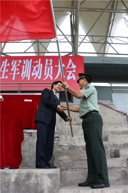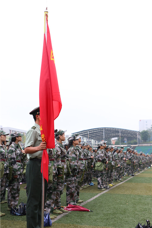 最后,来自教育学院的2015级新生贾东晓代表全体军训学员进行军训表态,保证认真参训,以优异的军训成果和良好的精神风貌展示川外学子的风采。接着,李克勇校长授“四川外国语大学学生军训团”团旗。