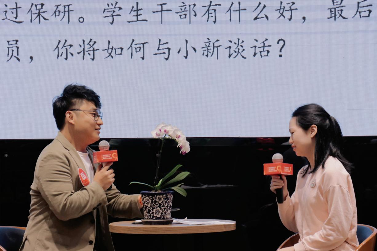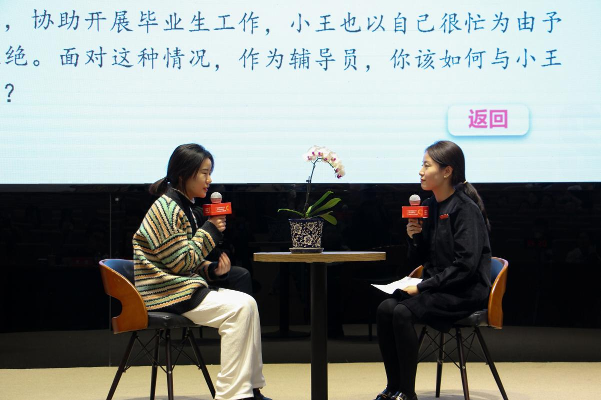 “谈心谈话”环节,选手们通过模拟与学生的谈话,生动再现了辅导员在日常工作中遇到的大学生学业、就业、心理健康、人际交往、违规违纪、入党教育等多方面情景,展示出选手们对学生特征、学生成长成才规律的了解把握程度,对学生的教育引导能力、解决问题困惑和实际问题的能力等。谈话后选手结合所谈内容进行简短总结,分析具体问题和应对措施,并接受评委的提问。