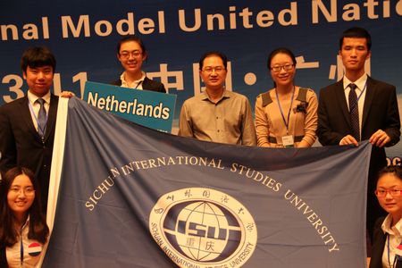 本次模拟联合国大会中,我校代表的国家是荷兰。作为欧盟成员国,荷兰在对妇女地位与权益的保护上一直处于世界领先地位。三位代表借助国家优势,表明立场、根据自身情况进行提议,积极联合相关国家,并与各国代表相互磋商、辩论。在本次大会中,川外学子审时度势,在理解体会中国联合国协会副会长兼总干事张小安对如何当好一名外交官做出的期望后,三位代表在各自会场都有骄人的表现。其中,“杰出代表”获得者王思懿,在第一个分会议期间,即收到了各国通过志愿者传来的纸条表明愿意合作的意向,并获得了评委和主席团的青睐,充分展示了川外学子的学术水平以及个人魅力。第二委员会的汤雪霏和应侃积极配合,与各国代表深入讨论话题。在全体联系大会上,三委代表王思懿做出的介绍性演讲掷地有声,赢得了与会代表的诚挚好评,多次的演讲、针对性提问使她给大家留下深刻的印象。同时,汤雪霏也在八十多个国家,160名代表中中积极取得发言机会,在第二委员会的分委会议中提出了极有震慑力的观点,最终摘得“最佳沟通交流奖”。领队王思懿积极策划,带领汤雪霏、应侃认真完成立场文件,最终我校团队获得“最佳立场文件奖”。同时,我校观察员黄鑫、熊栎天也直接参与到了分委会议的过程当中,协助三位代表准备议程,获得佳绩。虽然观察员并没有设置奖项,但两位观察员的精彩表现也让更多的学校目睹了川外学子的风采,让与会人员知晓,四川外国语大学不仅是语言水平出众,而且是国家关系、外交、国际政治专业水平过硬的高水平院校。