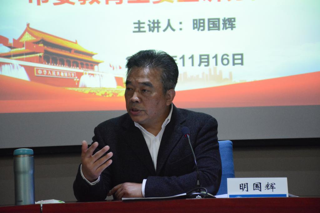 11月16日下午,重庆市委教育工委宣讲分队成员、校党委书记明国辉为我校部分教师和干部职工作党的十九大精神宣讲报告。