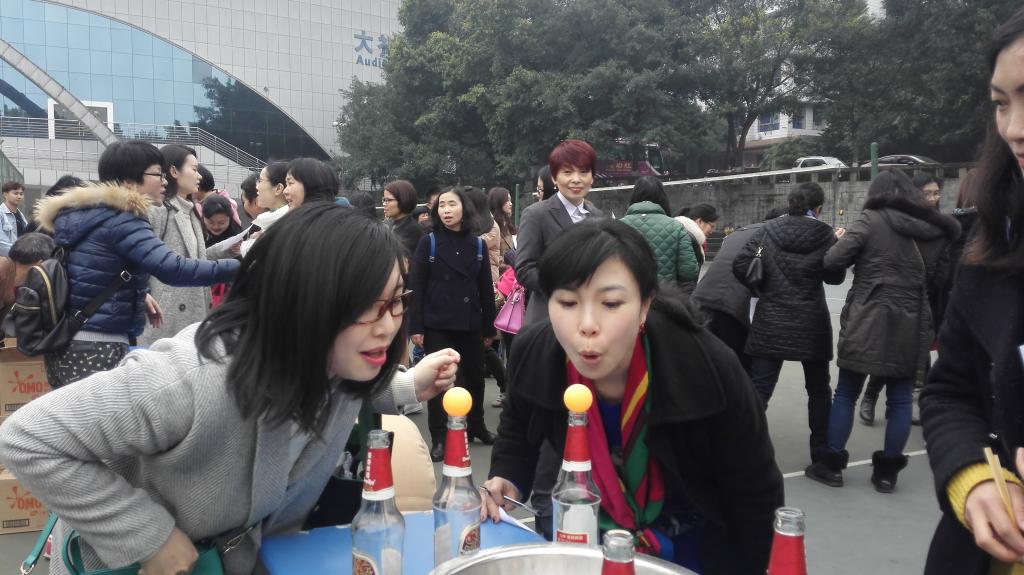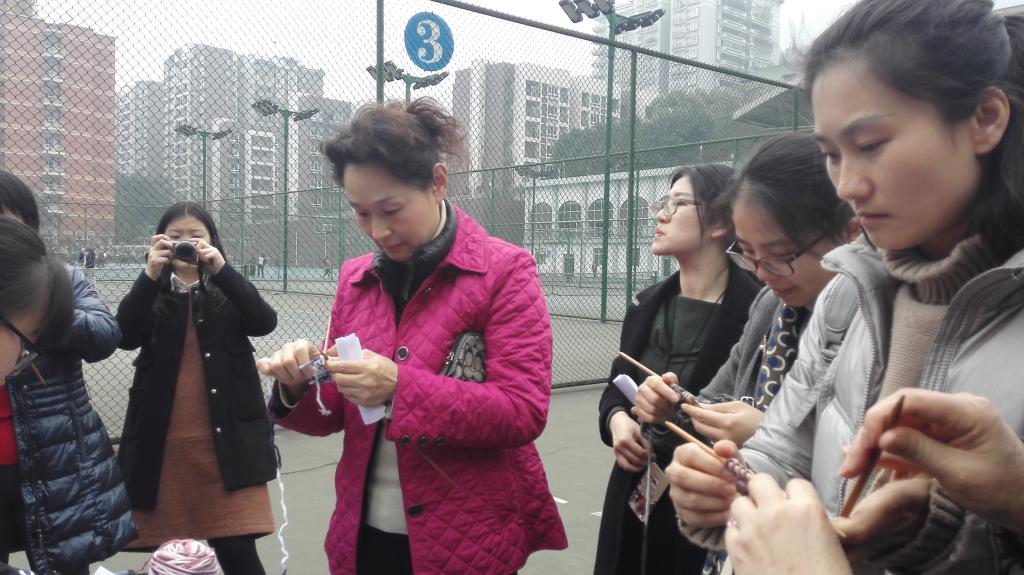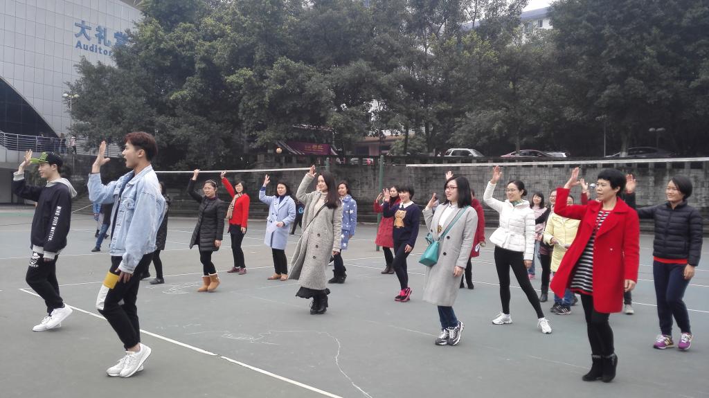 与此同时,“滚铁环”、“又稳又准”项目也在热火朝天地进行着。“滚铁环”项目让大家重温了儿时经典,现场一片欢声笑语。“又稳又准”项目需要参赛者用筷子将五个乒乓球先后从盆中夹起、放到啤酒瓶上,再一一将它们吹入盆中,考验了大家的稳定性和良好的心理素质;而作为大多数女教职工们的强项——“穿针引线”、“编织大赛”项目则进行的最为轻松而愉快。前几个项目完成后,女教职工们依旧热情不减,她们聚集在“我比你学”项目场地,在领舞同学的带领下,跟随音乐的节拍开始学跳排舞,充分展现了女教师们难得一见的动感和热情。