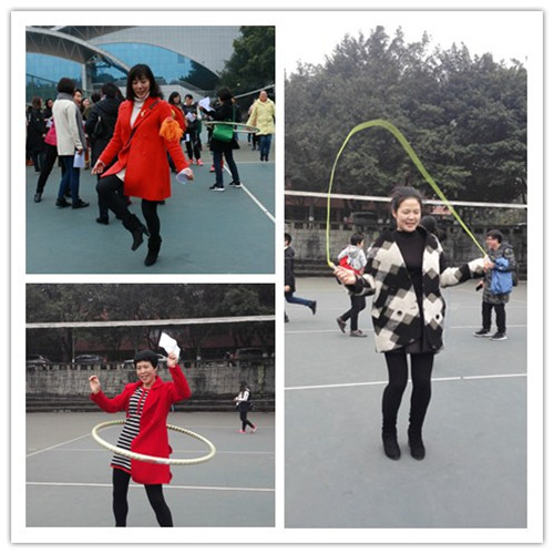 本次活动共设有6个项目,分别是“穿针引线”、“超女大比拼”、“编织大赛”、“又稳又准”、“滚铁环”以及“我比你学”。其中,“超女大比拼”项目人气居高不下。比赛中,女教职工们需要完成20次跳绳、5个呼啦圈和10次踢毽子。平日里端庄文静的女教师们,比起赛来也是毫不含糊,个个都是“超级女神”。