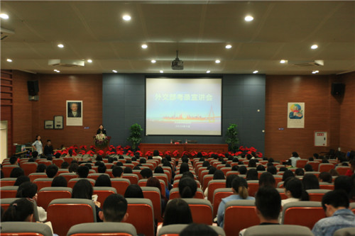 2016年4月9日上午,我校学术报告厅a栋迎来了一场外交风暴,外交部2017年度考试录用公务员宣讲会在这里拉开帷幕。本次宣讲会邀请了外交部参赞宫晓冬和外交部国际经济司史玮处长,多年来的实践经验和对世情国情的熟知,两位外交达人引爆了现场的氛围。