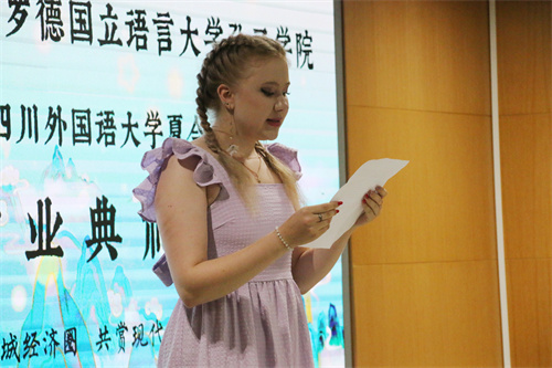 下语大孔院学生吴佳、玛丽雅代表全体营员感谢四川外国语大学所提供的提高中文、感知中国、了解中国人民的宝贵机会,感谢夏令营全体老师的辛勤付出和热情服务,两人表示这段难忘而美好的经历将会一直铭记于心。