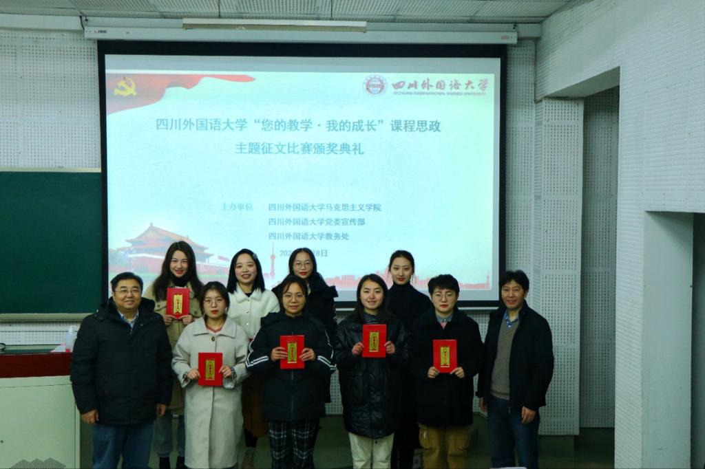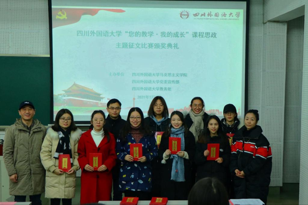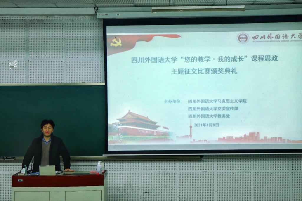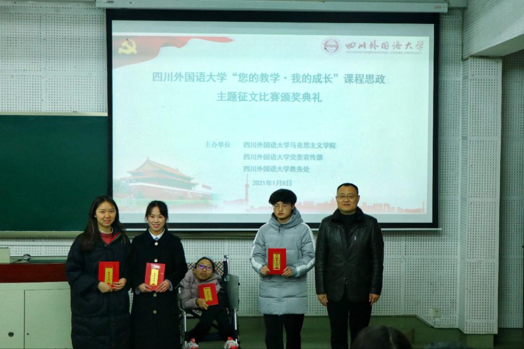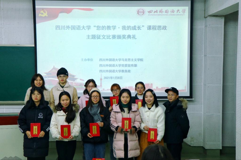 2021年1月8日中午,由四川外国语大学马克思主义学院、党委宣传部、教务处联合举办“您的教学•我的成长”课程思政主题征文比赛颁奖典礼在宏文楼1-2教室顺利举行。党委宣传部部长崔光军、教务处副处长王伟、马克思主义学院副院长王正宇,评委老师文华良、朱玲、曾善海、肖玲玲以及获奖同学出席了颁奖典礼。