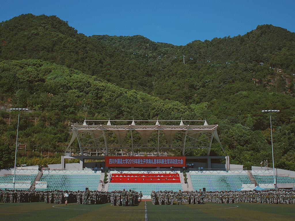 最后,会场奏响四川外国语大学校歌。2019级新生开学典礼暨本科新生军训动员大会在同学们的歌声中完美地落下帷幕。
