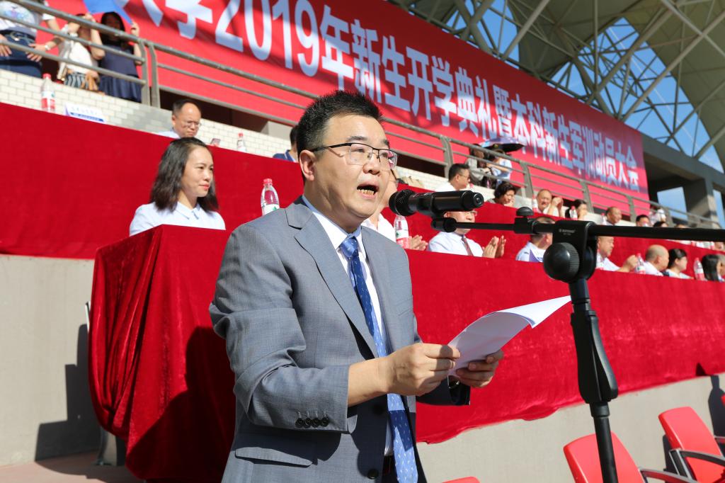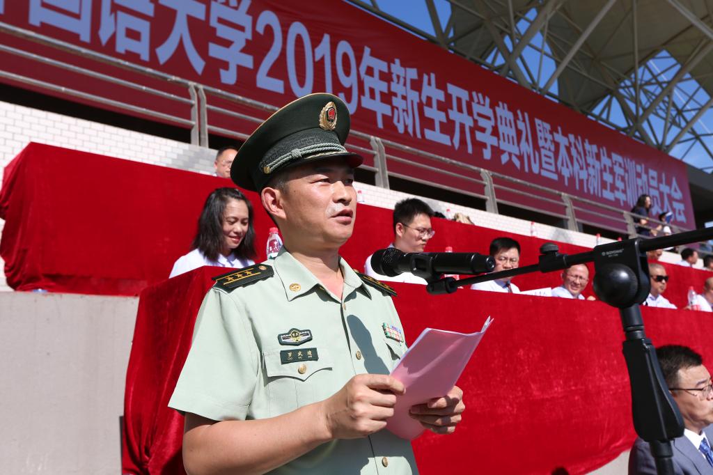 9月12日上午9时,我校2019级新生开学典礼暨本科新生军训动员大会在西区运动场隆重举行。武警重庆总队执勤第二支队副政委罗武建,我校党委书记邹渝,校长李克勇,副校长李彦,副校长李小川,副校长郑白玲,纪委书记苟欣文,出席此次大会。大会由副校长董洪川主持。