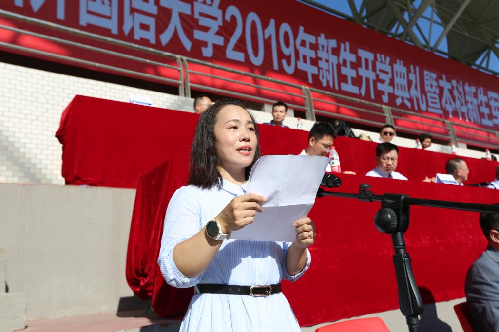 典礼在庄严的国歌声中拉开帷幕。伴随着悠扬的校歌,2019级新生完成了佩戴校徽仪式,正式成为川外人。