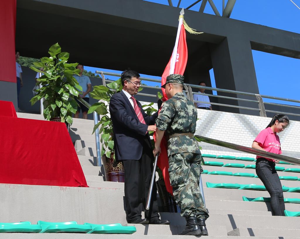 校党委书记邹渝向四川外国语大学军训团授予“四川外国语大学学生军训团”团旗。