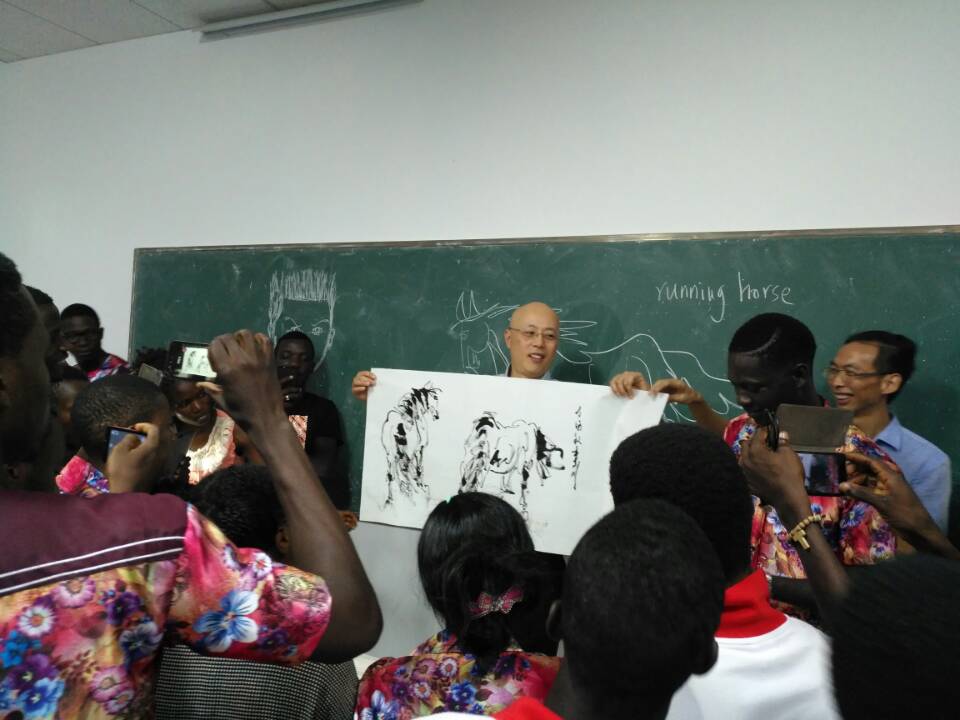 利用出访的机会,李小川副校长一行分别给洛美孔子学院学生做了3场中国文化讲座,并与孔院学生互动,共同体验中国历史文化之美。李小川做了《 中国画基本知识和技能》的讲座,并现场泼墨挥毫即兴作2幅骏马图,引起多哥学生对中国画极大的好奇和兴趣。马驭骅做了《汉字书法的演变与练习》的讲座,并教孔子学院学生练习毛笔字的基本方法和要领,激发学生对毛笔书法的浓厚兴趣。周文德做了《汉字学习法》的讲座。周文德的讲座着重从外国人学习汉字的难点入手,介绍学习方法,特别是部件学习法。通过实例解剖,把外国人视为困难的汉字学习变得简单易学,增加学习兴趣和学习效率。听讲座的有洛美大学孔子学院的学生和老师,现场气氛很好,同学们热情很高。讲座后,同学们还进行了中国歌曲演唱与表演。增进了多哥师生对中国文化的真切体验与感悟。