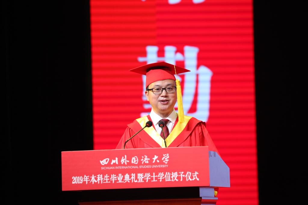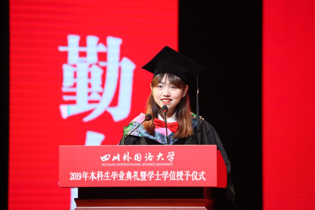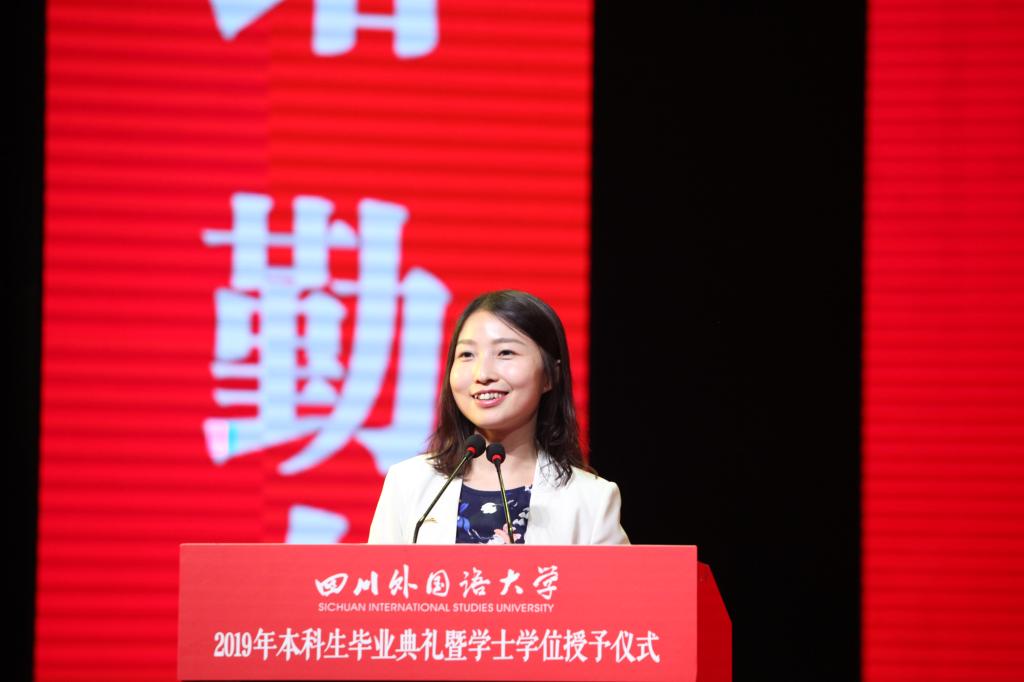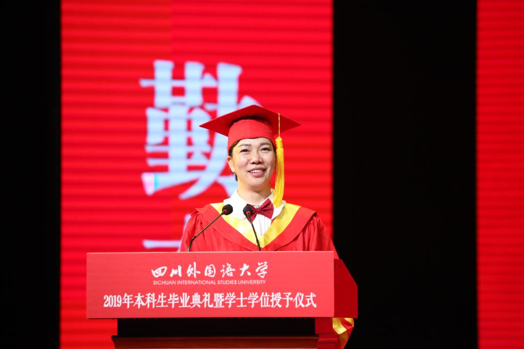 英语学院陈俞蓉作为毕业生代表在发言中对母校表达了不舍和感激之情,她说道:“不管将来身在何方,我相信‘团结、勤奋、严谨、求实’的校训将处处督促我们,‘守责、求实、开放、包容’的川外精神将时时激励我们。”教师代表日语系副教授陈可冉把日语教材中的一句话“佛度有缘人”送给毕业生们,向毕业生表达最衷心的祝福:“祝贺你们在云雾缭绕的歌乐山中修成正果,即将告别壮志路33号大院,从此仗剑天涯,去实现各自的抱负理想”。“选择坚持吧,坚持未必成功,可放弃注定失败……”校友代表李佳颖以《不忘初心,坚定前行》为主题,分享了自己在工作中的三个故事,以此来鼓励毕业生们,希望大家在今后的道路上创造出自己的价值。