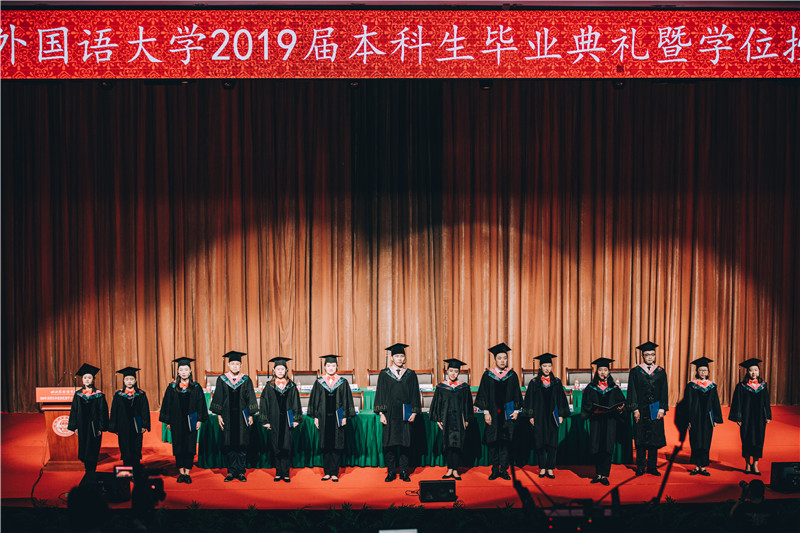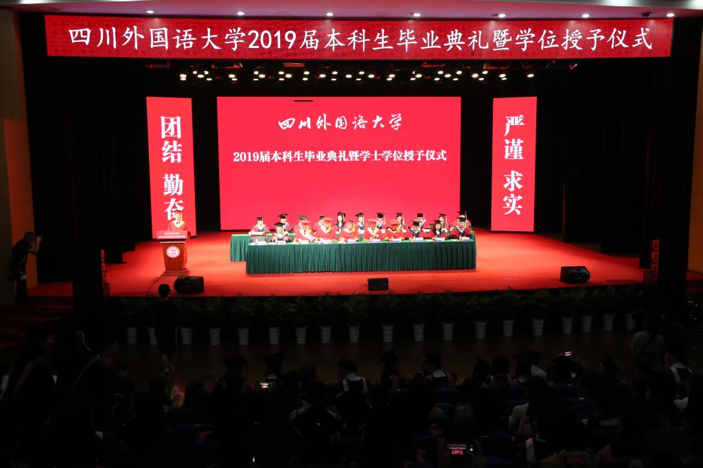 副校长祝朝伟宣读《四川外国语大学关于授予2019届杨诗源等3171名学生学士学位的决定》、《四川外国语大学关于表彰2019届优秀本科毕业论文(作品)的决定》和《四川外国语大学关于表彰2019届优秀本科毕业论文指导教师的决定》,李小川宣读《四川外国语大学关于表彰2019届优秀本科毕业生的决定》、《四川外国语大学关于表彰2019届本科毕业生就业创业先进个人的决定》和《重庆市教育委员会关于公布2019年普通高等教育优秀毕业研究生和优秀大学毕业生名单的通知》。校领导为表彰师生颁奖,为毕业生代表授予学位,并送上深情的祝福和叮嘱。