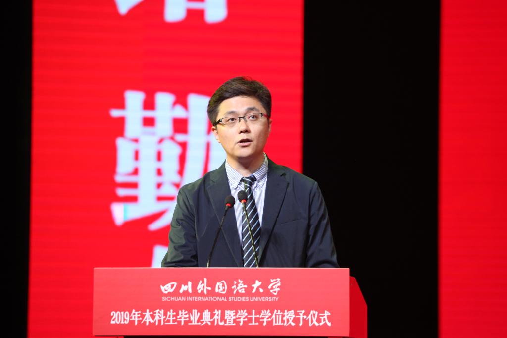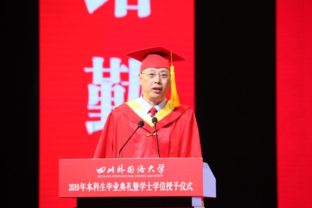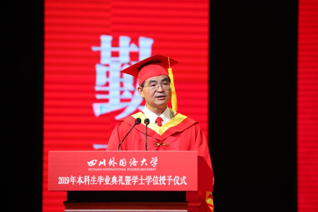 “新征程,新机遇,新挑战,衷心祝愿你们无愧时代、不负韶华,用青春之笔书写出精彩的人生!”校长李克勇在致辞中对毕业生表示热烈祝贺,向辛勤付出的老师表示感谢,对川外近年来取得的成就进行了总结,为川外的改变和川外学子获得的成绩感到骄傲。他对毕业生提出了希望:忠于祖国、忠于人民,把自己的理想祖国的前途紧密联系起来,肩负起复兴民族的重任,不负伟大的时代。