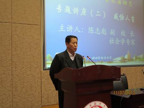 讲座中,陈志彪副校长分别从政治多极化、经济一体化、人口老龄化、人才能力化、信息全球化和社会和谐化等六个方面进行了讲述,并着重介绍了提高个人能力的路径和经验。关于感悟人生的勤奋、性格和知识三大方面,陈校长告诉大家:勤奋奠定人生,性格决定成败,知识改变命运。同时还要具有向水学习、向地图学习的良好意识,不断明确人生的目的、意义和方法。他还强调情感、知识、道德和想象等四种力量对人的重要作用,注意把握人生道路上的五个度,包括高度(目标)、厚度(知识)、力度(特点)、强度(原则)、宽度(交友)。