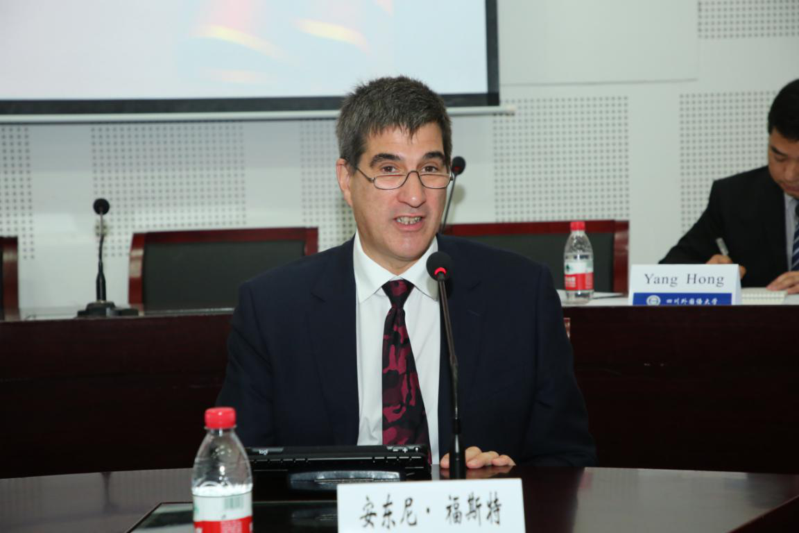 Anthony Forster校长讲话,他从学术排名、人文环境、生活环境等方面介绍了英国埃塞克大学。他指出,埃塞克斯大学学术资源丰富,支持毕业生创新创业,他希望新生们能够到埃塞克斯大学学习研究,并有所收获。他希望川外与埃塞克斯大学保持并加强合作关系,培养出适应新时代发展的国际化高端人才。