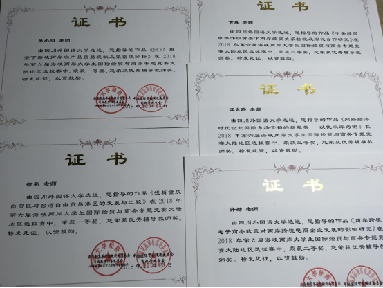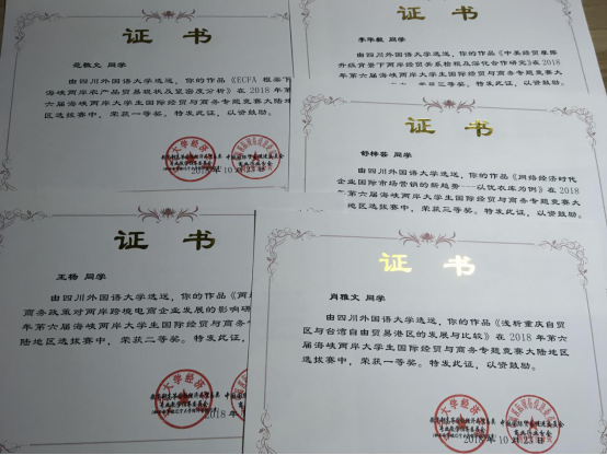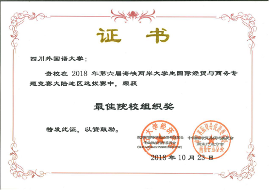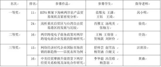 近日,在由教育部高等学校经济与贸易类专业教学指导委员会、中国国际贸易促进委员会商业行业分会共同主办的“2018 年第六届海峡两岸大学生国际经贸与商务专题竞赛大陆地区选拔赛”中,我校国际商学院派出的5支参赛队伍均获奖,取得了两个一等奖、一个二等奖、两个三等奖的优异成绩,参赛队伍指导老师获得优秀辅导老师奖,我校也获得最佳院校组织奖。