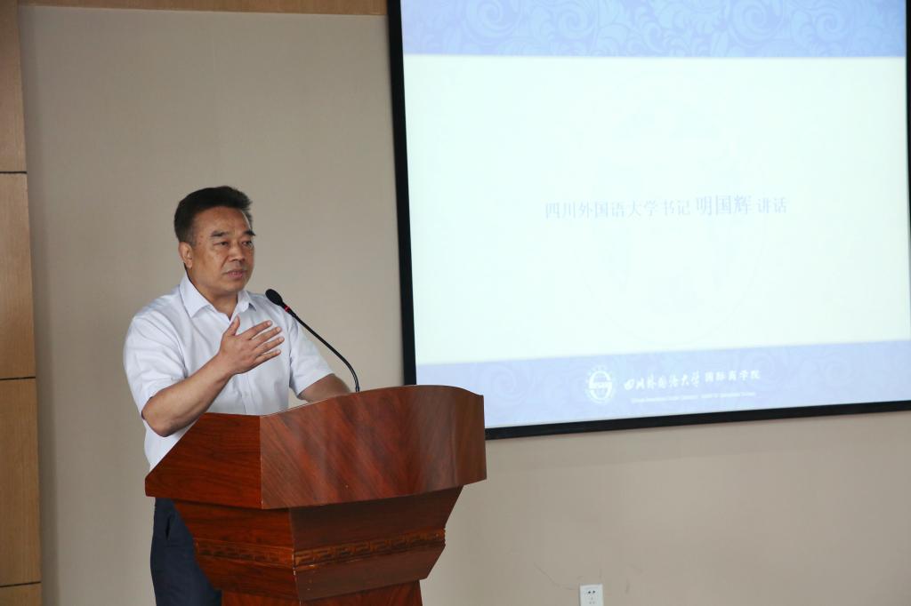 明国辉在讲话中首先对川外与重理工校级合作项目的缘起做了回顾,他指出两校间的深度合作这是第一次尝试,现在看来合作很成功,两校各部门的沟通和对接实效显著。他还指出,同学们在川外一年的学习中学到了知识,心情愉悦,对川外也充满的感情,今后不管同学们走到哪里,都是川外的学生;也希望同学们回到重理工,取得更好的成绩。
