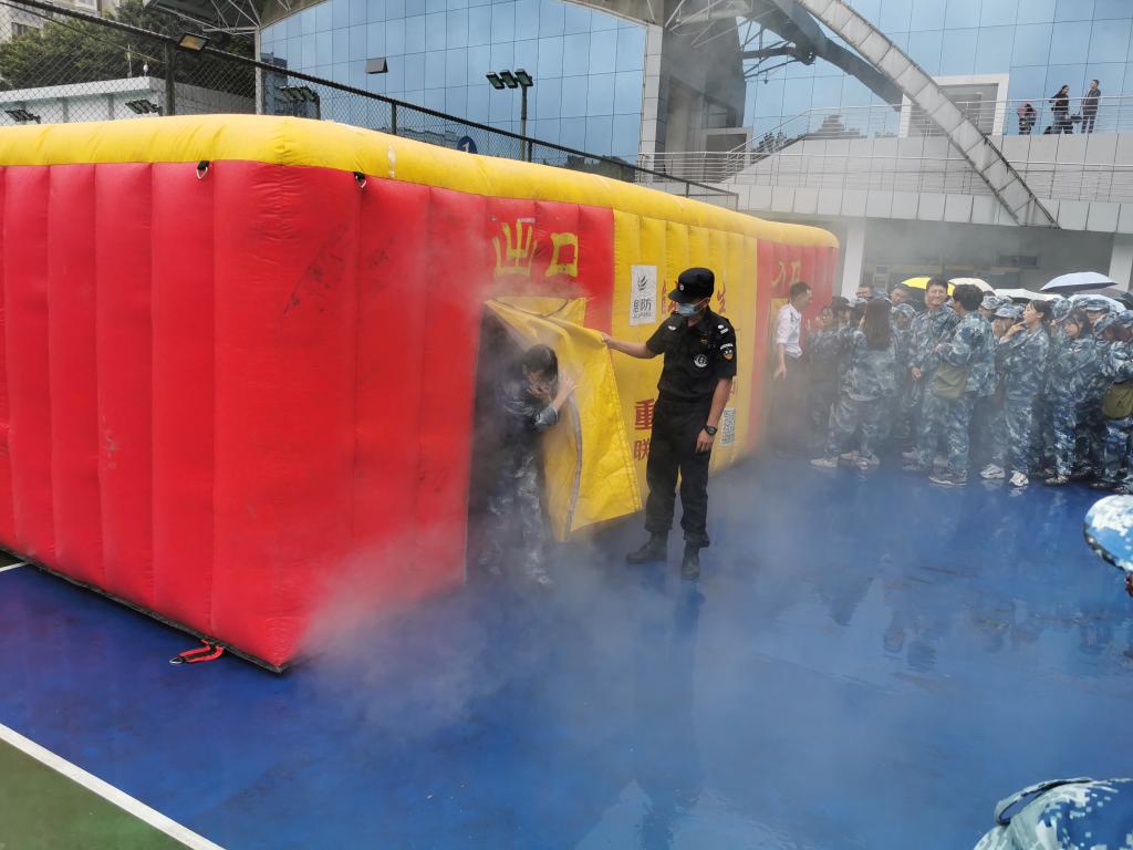 在模拟火场逃生训练中,同学们根据教官讲授的“低姿、捂口鼻、看指示牌”的逃生要领,在疏散引导员的指挥下,动作规范、安全有序地从模拟火场中疏散逃生。