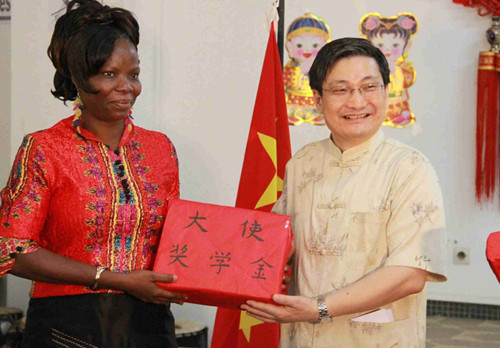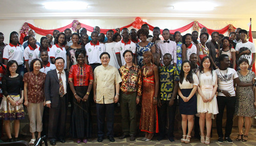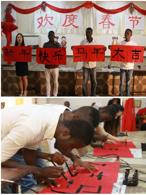 活动开始之前,刘豫锡大使和洛美大学校长诺努(nonou)、外方院长佳思美(tchassim)分别发表了热情洋溢的讲话。刘大使在讲话中高度赞誉了中多两国长期的友好合作和两国人民兄弟般的友谊,充分肯定了孔子学院的工作成绩,热情洋溢地向各位来宾和孔院师生致以新春的祝福,鼓励孔院学生好好学习,在马年里取得好的成绩,并向上期末考试成绩优异的学生颁发了中国大使奖学金。洛美大学校长在讲话中,重点介绍了去年12月在北京召开的第8届全球孔子学院大会的盛况,高度评价了孔子学院的工作,他指出孔子学院是中多两国文化和教育领域的友好合作项目,是洛美大学和四川外国语大学友好合作的成果,孔子学院已成为洛美大学和多哥了解中国文化和多元文化交流的窗口,通过孔子学院,洛美大学正在扩展同中国有关大学的交流与合作。孔子学院外方院长在讲话中向来宾和师生介绍了马在中国年里代表勤劳、智慧、勇往直前等文化内涵。